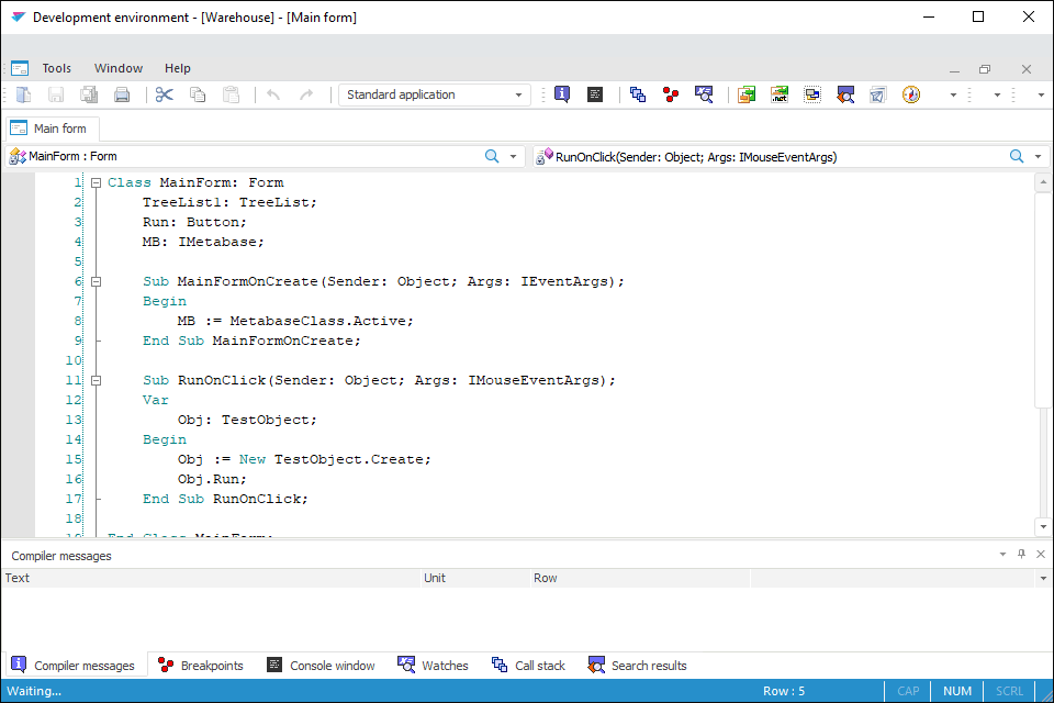 The development environment window contains a set of panels that are used to create and set up user forms, units and assemblies and their .NET equivalents. Name of the development environment main window contains repository name and name of currently opened object.