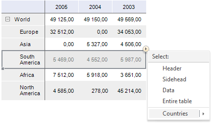 To set up dimension settings, select a dimension or its level in the table as in the case of selecting common elements of a table. Dimension settings are determined in the Dimension group of tabs of the side panel, dimension level settings are determined in the Level group of tabs of the side panel.