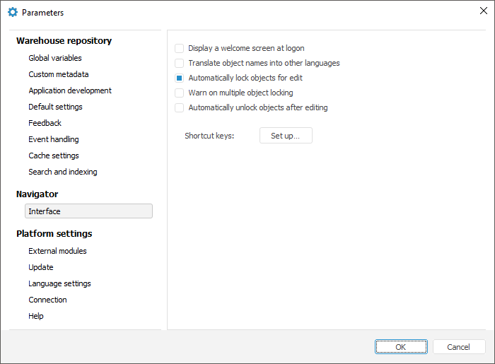 Several users can be connected to the repository at the same time, and thus repository objects can be edited by several users at the same time. Locking can be used to prevent object from being edited by several users. Object locking can be changed on the Interface tab of the Parameters dialog box.