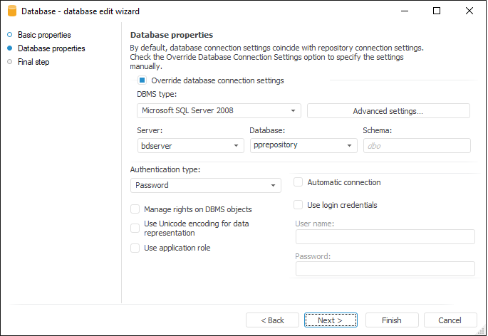 Connection to external databases is used to get access to data that are stored in external sources. The connection to external databases provides a possibility to store actual database settings, to get access to objects form another repository and also to get access to multidimensional databases built on Microsoft Analysis Services, SAP NetWeaver BW and other platforms.