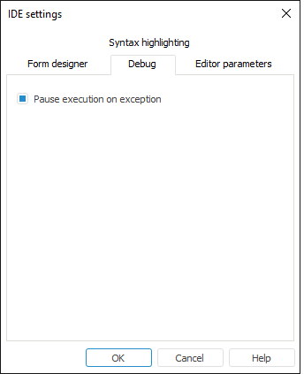 This tab contains settings that determine system's behavior if an exception is thrown when debugging a custom assembly/unit/form.
