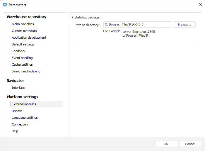 NOTE. This step is necessary if R is installed on the workstation different from the workstation, where Foresight Analytics Platform is installed. If the R package is installed on the same workstation where Foresight Analytics Platform, path to the R directory will be already specified.