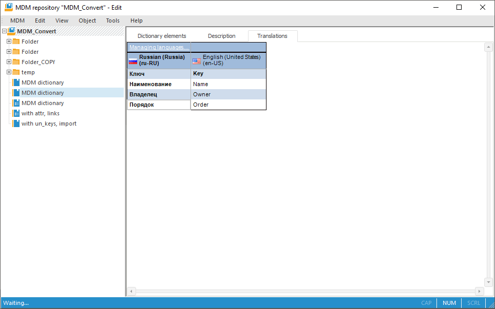 1. Open MDM dictionary for which translation must be set up.