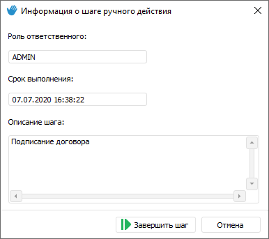 в информации о шаге ручного действия – ознакомьтесь с описанием шага и, если необходимое действие было выполнено, то можно завершить шаг прямо из окна информации, нажав кнопку «Завершить шаг»: