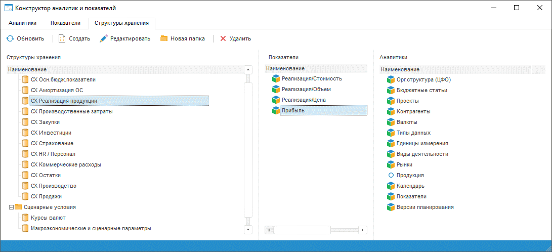 Для работы со структурами хранения используйте вкладку «Структуры хранения» конструктора аналитик и показателей.