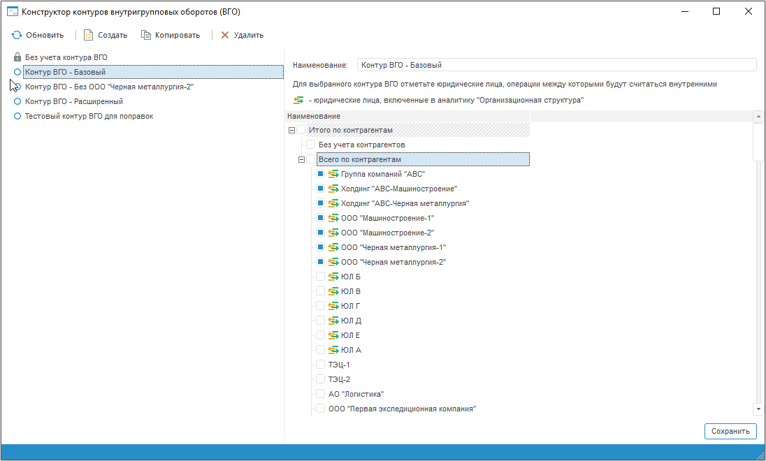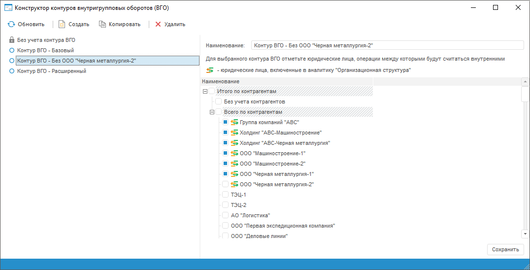 Контур внутригрупповых оборотов (ВГО) представляет собой совокупность юридических лиц, являющихся элементами аналитики «Контрагенты», операции между которыми будут считаться внутренними.