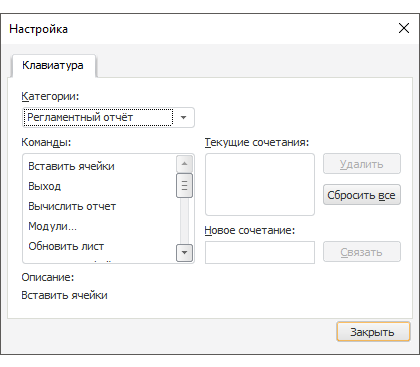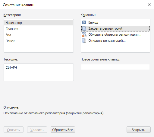 Текущие/Текущие сочетания. В данном поле отображаются настроенные для выбранной команды сочетания клавиш. Для удаления текущего сочетания клавиш выделите его и нажмите кнопку «Удалить». Для присвоения выделенной команде нового сочетания клавиш введите его в поле «Новое сочетание клавиш/Новое сочетание». Ввод осуществляется автоматически при нажатии нужных клавиш. Далее нажмите кнопку «Связать». Чтобы сбросить все текущие настройки сочетаний клавиш, нажмите кнопку «Сбросить все»;