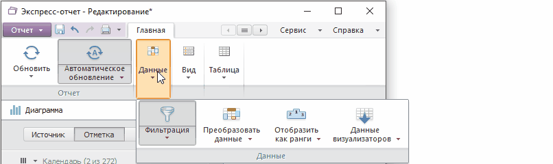 Некоторые вкладки выводятся на экран только по мере необходимости. Такие вкладки называются контекстными, так как для их появления необходимо срабатывание какого-либо события. Например, вкладки «Объект.Диаграмма» и «Объект.Формат» отображаются в инструменте «Отчёты» при выделении диаграммы на листе отчёта.