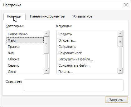 Для настройки панелей инструментов вызовите контекстное меню в области главного меню или панелей инструментов и выполните команду «Настройка».