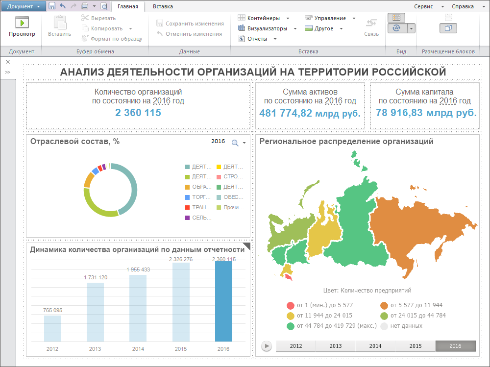Инструменты анализа данных и построения отчётов позволяют использовать различные визуализаторы данных.