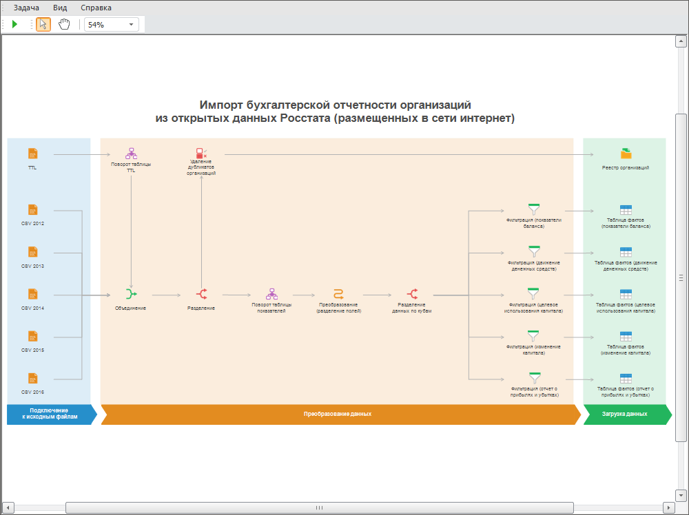 Инструмент «Задача ETL» предназначен для извлечения данных из внешних источников, их преобразования и загрузки в приёмники данных.
