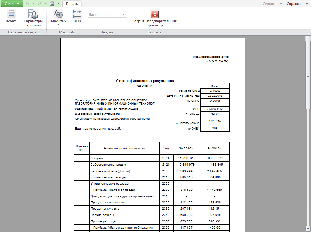 настройка отчёта под печать;