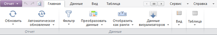 Ряд инструментов продукта «Форсайт. Аналитическая платформа» в своем интерфейсе используют не ленту, а панели инструментов. На панелях инструментов продублированы часто используемые команды главного меню. Также могут располагаться различные элементы управления, недоступные в главном меню. При необходимости пользователь может создать собственную панель инструментов и наполнить ее необходимыми элементами управления.