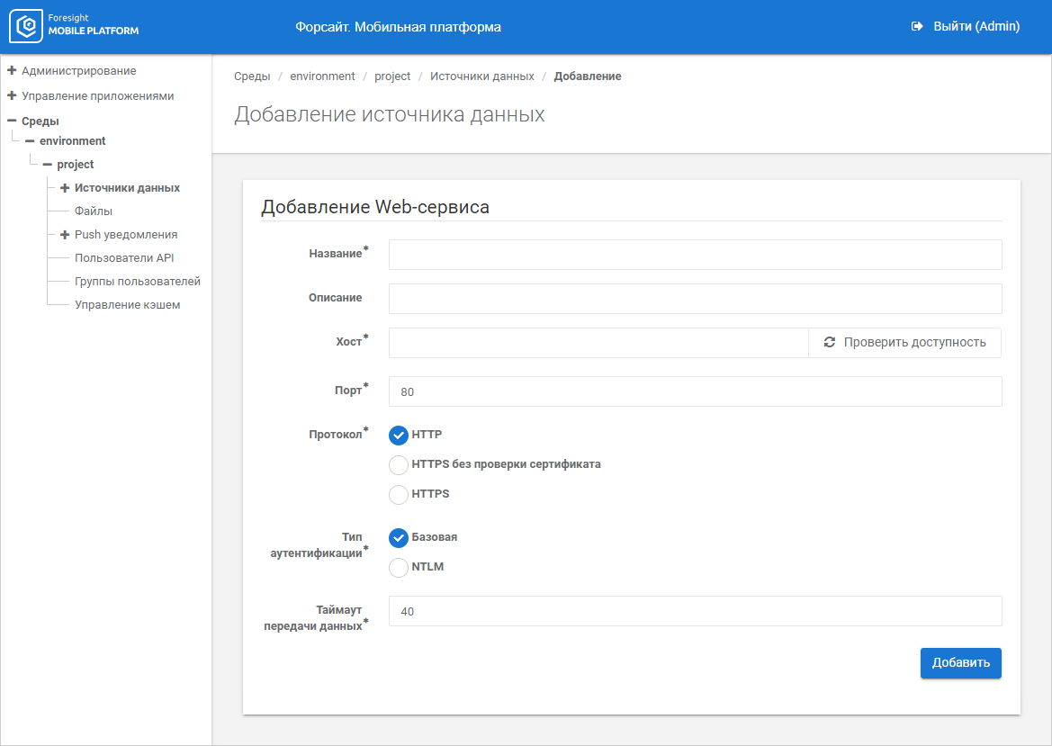 Примечание. Для источников данных JSON, WEB, Foresight Web автоматически добавляются анонимные учетные данные по умолчанию на вкладке «Учётные данные» после настройки подключения. Для источника данных Exchange добавление учетных данных доступно только после настройки подключения.