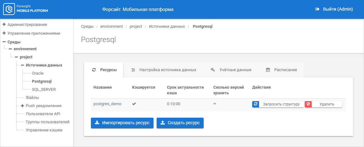Примечание. Кроме импорта ресурса, для источника данных Postgres Pro/PostgreSQL доступно создание ресурса с помощью кнопки «Создать ресурс».