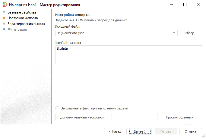 В поле «Исходный файл» укажите место расположения JSON-файла, который будет являться источником данных. Для выбора файла нажмите кнопку «Обзор». В поле «JSONPath-запрос» укажите запрос, в соответствии с которым будут отбираться импортируемые данные.