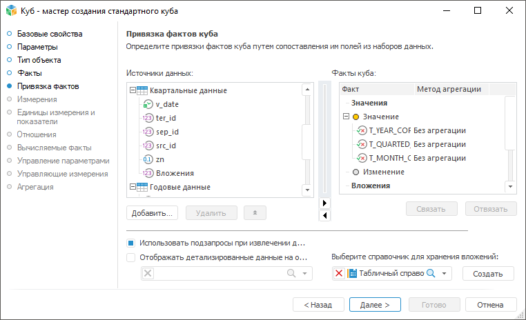 Для удаления привязки факта куба выберите факт в списке и нажмите кнопку «Отвязать».