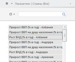 Наименование вкладки со списком элементов формируется из наименований исходных измерений, разделенных вертикальной чертой. Например: «Территории | Показатели», где «Территории» и «Показатели» - это названия исходных измерений.