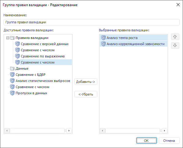 В списке «Доступные правила валидации» отображаются все правила валидации, доступные для объединения в группу. В списке «Выбранные правила валидации» отображаются правила валидации, которые уже объединены в группу.