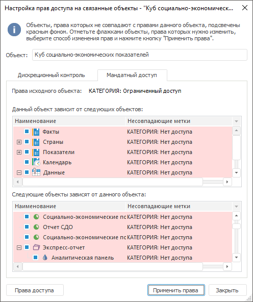 Примечание. Красным цветом подсвечиваются объекты, чьи права не совпадают с правами исходного объекта. Для таких объектов флажки устанавливаются автоматически.