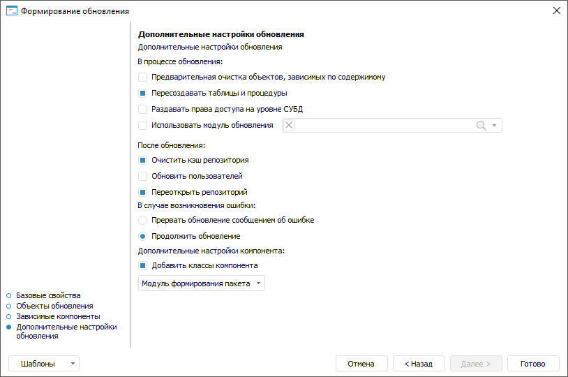 При необходимости настройки формирования обновлений возможно сохранить в шаблон в формате .XML для повторного использования. В шаблон сохраняются: наименование обновления, список всех объектов с установленным составом обновления и состояние отметки (флажок установлен /не установлен), дополнительные настройки. В шаблон не сохраняется состояние отметки по обновлению зависимых компонентов, флажки установлены всегда по умолчанию. Нажмите на кнопку «Шаблоны» и выберите из списка один из вариантов: