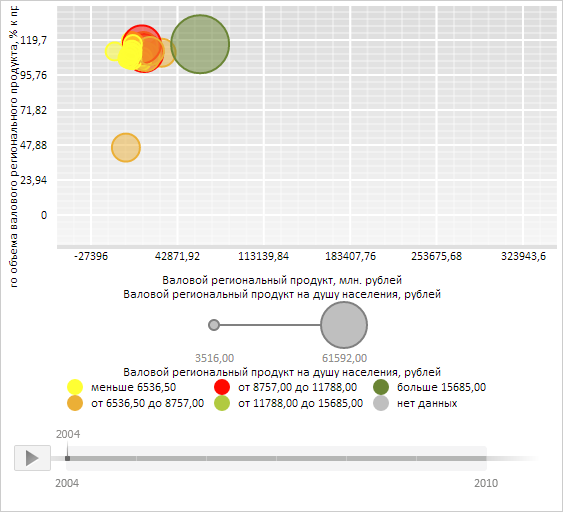 В результате выполнения примера пузырьки пузырьковой диаграммы стали прозрачными, а цвет заливки для пузырьков, соответствующих значениям, меньшим первому элементу шкалы, изменился на жёлтый: