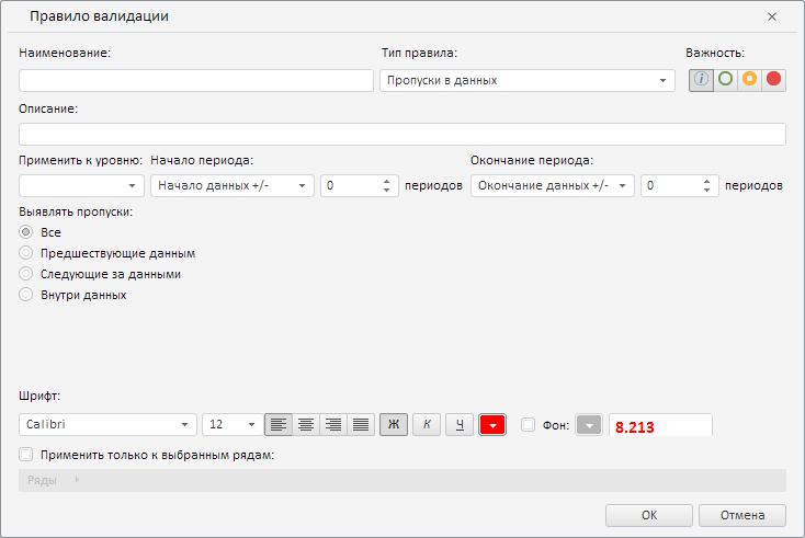 Для выполнения примера необходимо наличие экземпляра класса ValidationRulesPanel с наименованием «validationRulesPanel» (см. «Конструктор ValidationRulesPanel»). Отобразим диалог с настройками правила валидации: