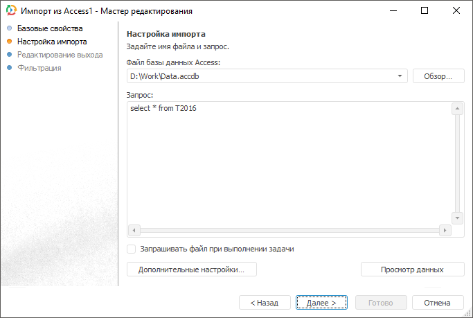 Если установить флажок «Запрашивать файл при выполнении задачи», то при выполнении задачи ETL будет открыт диалог для выбора файла базы данных Microsoft Access. По умолчанию флажок снят, при этом работа осуществляется с тем файлом, который указан в поле «Файл базы данных Access».