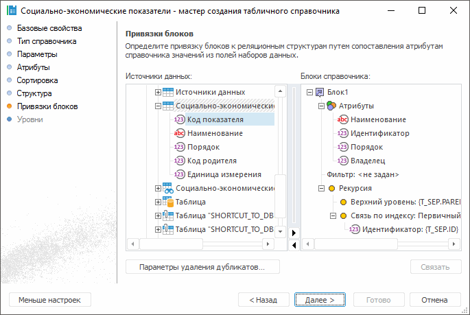 В списке объектов схемы выберите таблицу «Справочник социально-экономических показателей», поля которой необходимо привязать к атрибутам справочника. Свяжите поля с атрибутами следующим образом:
