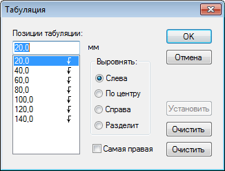 Для очистки всех позиций табуляции нажмите кнопку «Очистить».