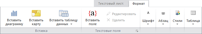 При активном текстовом листе становится доступной группа «Вставка» вкладки «Текстовый лист. Формат» ленты инструментов, с помощью которой осуществляется вставка объектов на текстовый лист и настройка их параметров.