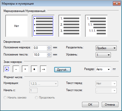 Для настройки списка используйте окно «Маркеры и нумерация».