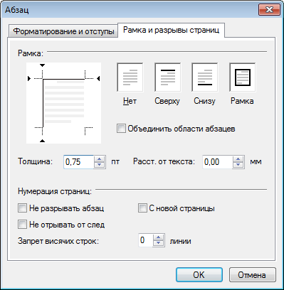 Для добавления рамок вокруг текста и настройки нумерации страниц используйте вкладку «Рамки и разрывы страниц»: