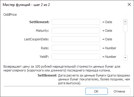 | =OddlPrice(A1, A2, A3, 0.0375, 0.0405, 100, 2, 0) | 99,88р. | Цена за 100 рублей нарицательной стоимости ценных бумаг для