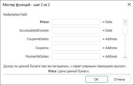 Мастер функций для функции RedemptionYield выглядит следующим образом: