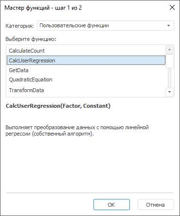 Подключенные пользовательские функции будут отображаться мастере функций в категории «Пользовательские функции», например: