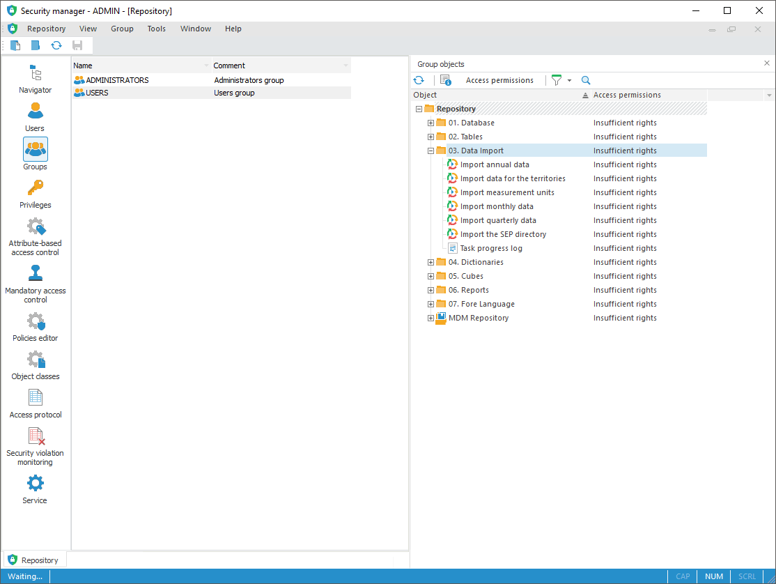 Groups of users are system security subjects, which main purpose is to combine several users under a single account to gain unified control of access permissions of these users. The members of the groups becomes users and other groups, created in Forersight Analytics Platform, domain groups and users.