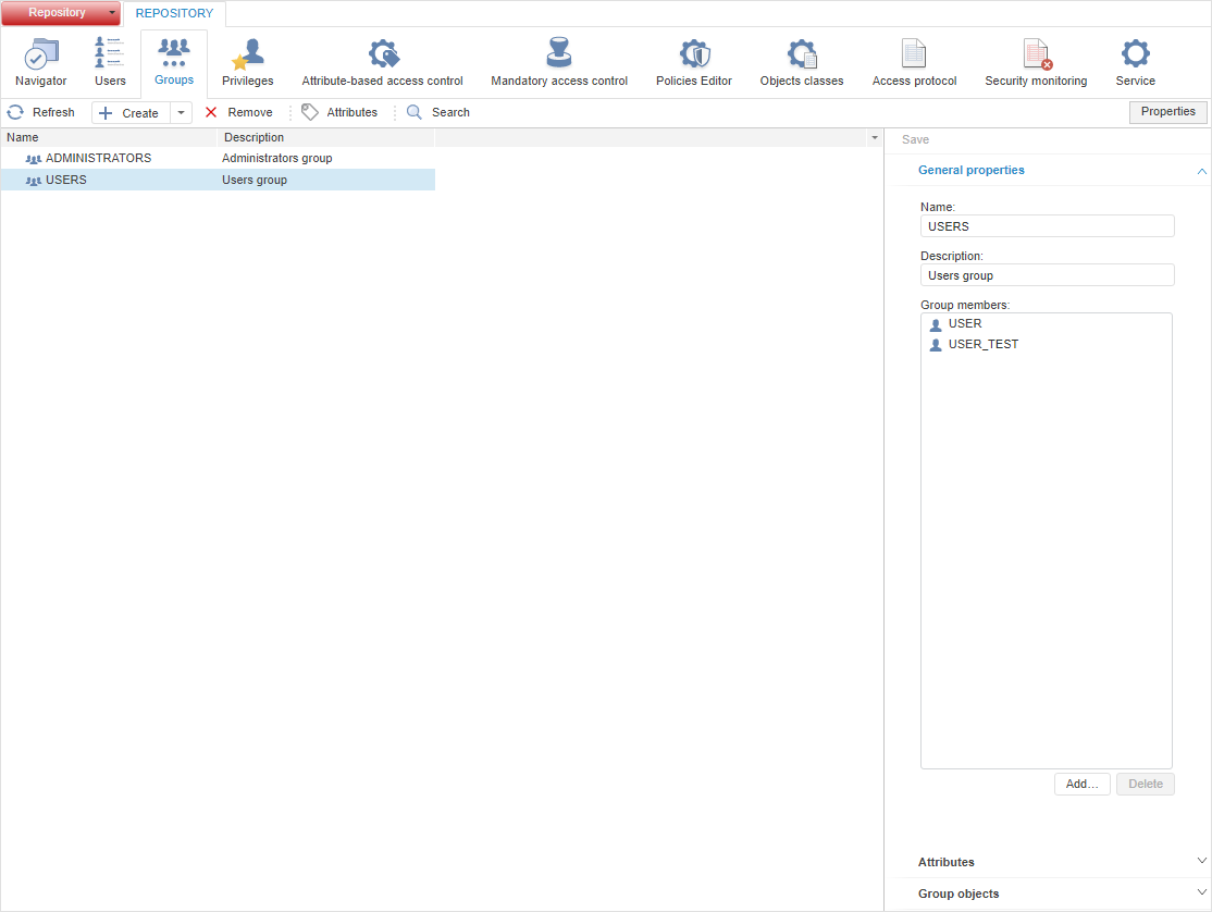 Specific access permissions can be specified as for the group as for the individual user. In this case the permissions are implemented for all group members (domain and built-in users or groups) and used as an extension of their personal permissions. Permissions of any system user include their own permissions as well as permissions of all groups, to which this user belongs.