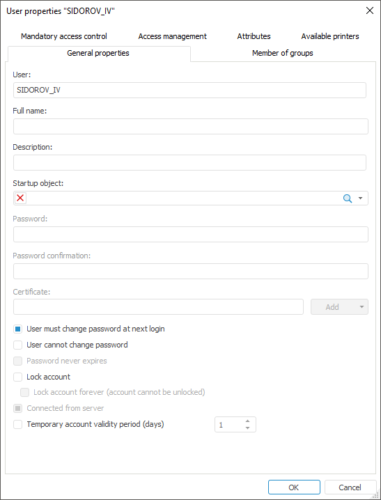 • For information security administrator on viewing properties of the already existing user the Startup Object box will be dimmed.