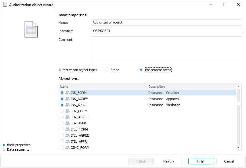 To work, dynamic data segments, that are created on starting process step and are active till it is finished, are defined in processes using authorization objects.