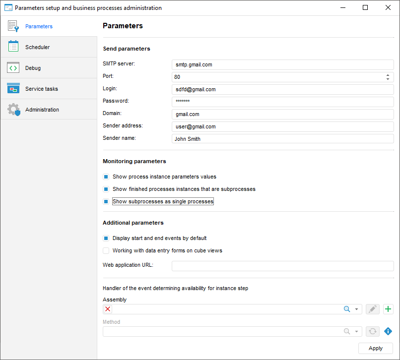 Business processes setup includes parameters of e-mail notification sending, monitoring parameters and advanced parameters of processes.To set up business processes parameters, use the Parameters page.