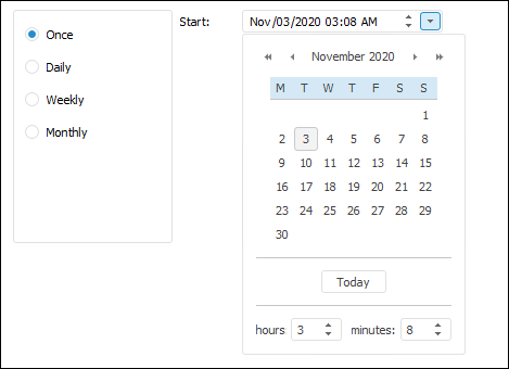 1. Set process start date and time in the Start box. To change date use the keyboard, the radio buttons or select a date in the drop-down calendar.