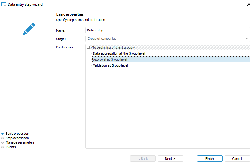 Predecessor. Select the predecessor step in the list, after its execution the created step is started. The list is displayed for the second and the following steps.