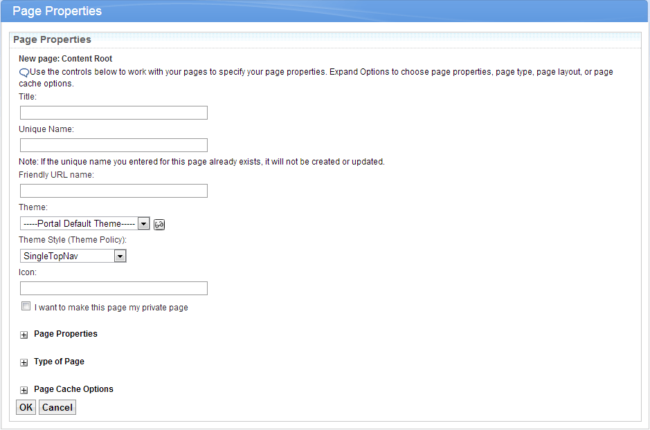 1. Enter the title and unique name of the page in the corresponding boxes. Click the OK button.