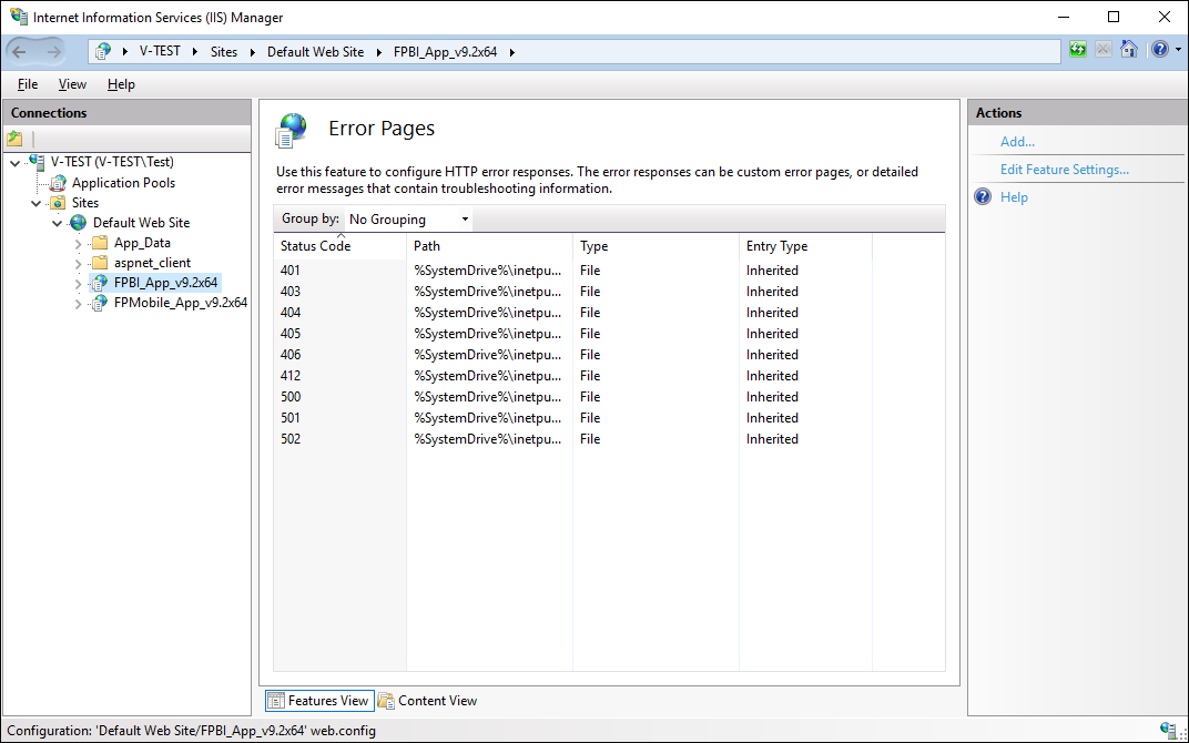 1. On the Actions panel select Edit Feature Settings. The Edit Error Pages Settings dialog box opens: