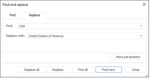 4. Click the Replace button for consequent replacing of data in the table cells, or the Replace All button to replace all found values.