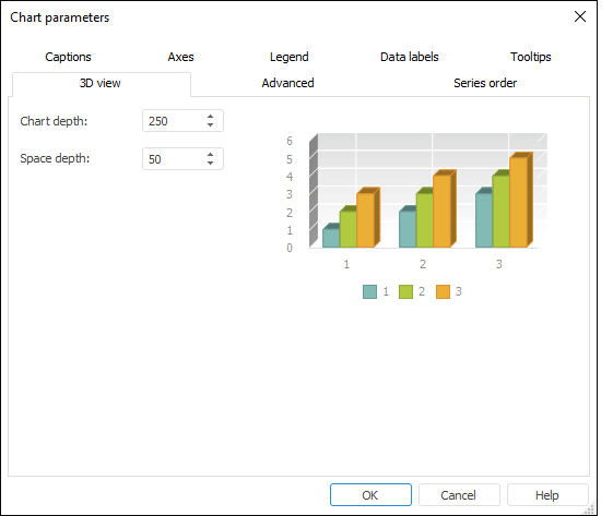 For advanced set up 3D view of the chart, go to the 3D View tab of the Chart Parameters dialog box. The tab is displayed if 3D chart view is enabled.