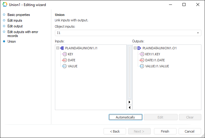 The Union page is used to establish a link between input and output fields.
