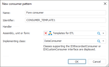 Handler. In the drop-down lists select a development environment object (assembly, module, Fore or Fore.NET form) and a class that contains consumer implementation. The list of valid classes contains all classes that implement the IDtRecordsetConsumer or IDtCustomConsumer interfaces.