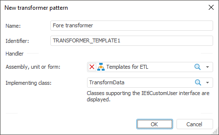 Handler. In the drop-down lists select a development environment object (assembly, module, Fore or Fore.NET form) and a class that contains transformer implementation. The list of valid classes contains all classes that implement the IEtlCustomUser interface.